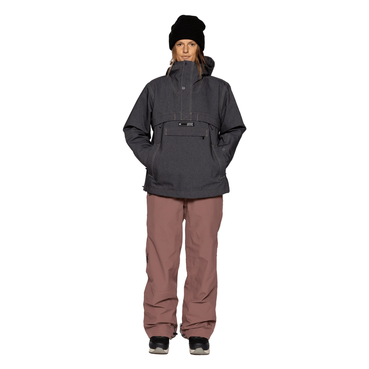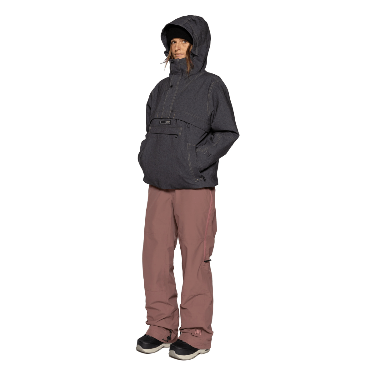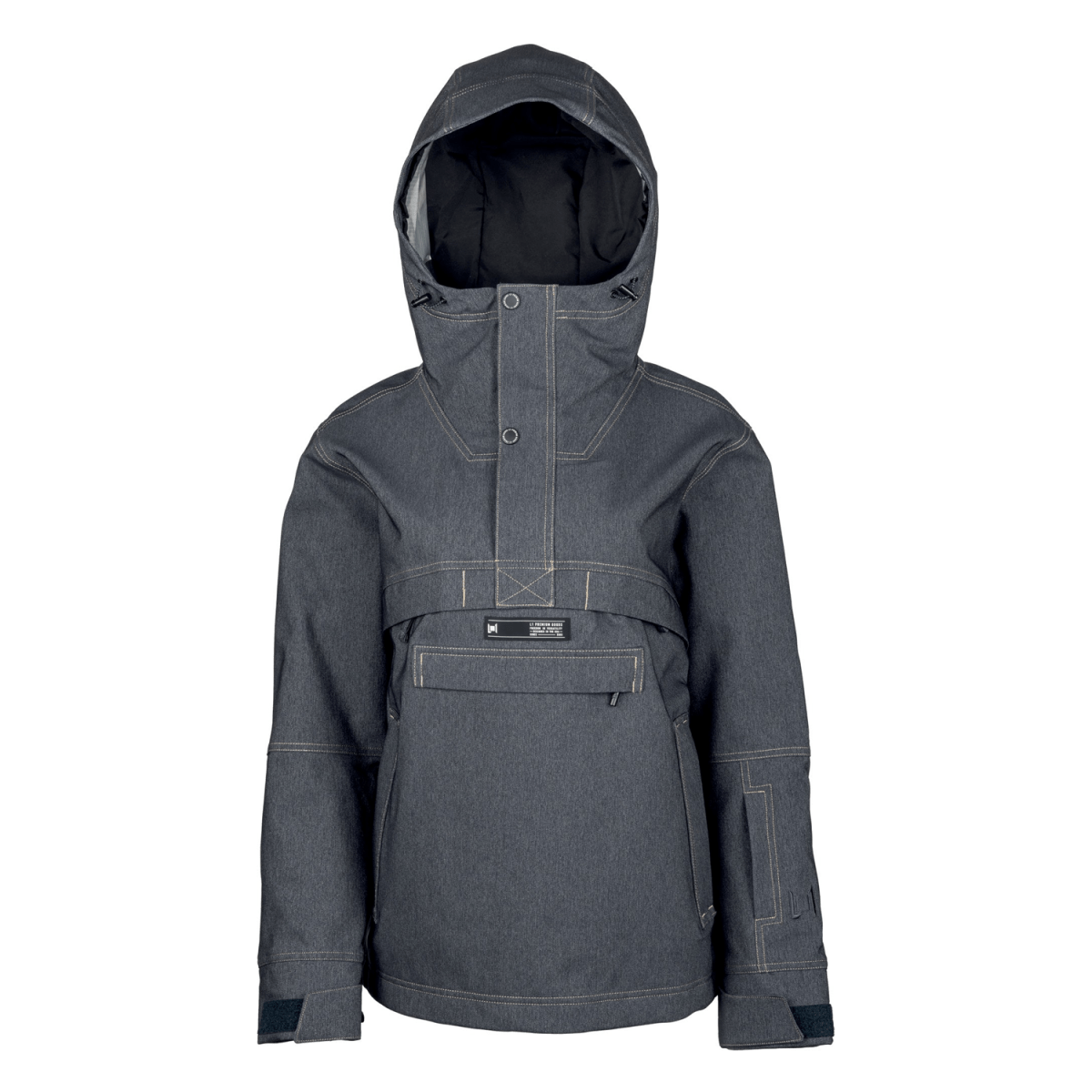 Designed with a loose fit and an anorak-style pullover construction, this jacket features a 3/4 front zip with snap and hook-and-loop closures, a large chest pocket, and zippered hand and pass pockets for secure storage. Double mesh-lined underarm vents regulate temperature during active use, while the adjustable hood, cuffs, and snap-away powder skirt provide versatile coverage. Additional details include stretch sleeve gaiters with thumbholes, a soft chin guard, and durable YKK zippers for reliable closure integrity.