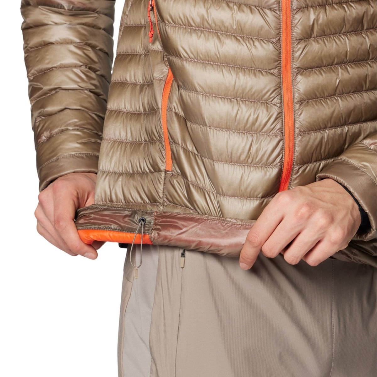 Every feature is crafted with intention: the hood cinches down to block gusts, synthetic fill at the cuffs keeps wet snow from creeping in, and a drawcord hem seals out drafts. Zippered hand pockets provide secure storage, and when you don’t need the jacket, it stuffs neatly into its own pocket and clips to your harness or pack. Ultralight yet surprisingly warm, it’s a go-to piece for climbers, trekkers, and explorers who want reliable heat without the weight—and a smaller impact on the planet they roam.