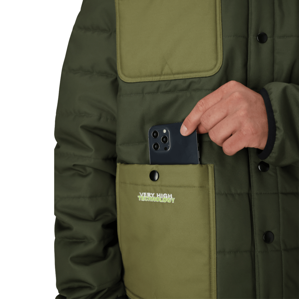 The 686 Huf Puffer Insulated Jacket starts with a 2-layer infiDRY 10K waterproof and 10,000 g breathable polyester shell treated with a PFAS-free DWR for reliable storm protection. infiLOFT insulation delivers 100 g warmth in the body and 80 g in the sleeves, wrapped in an articulated fit that moves easily on snow or concrete.